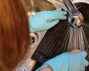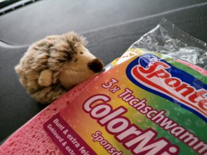 Hier hilft mir der “Mosaik”-Scheuerschwamm von Spontex, der verspricht, nicht nur kratzfrei zu reinigen, sondern auch weniger Fussel zu bilden als handelsübliche Scheuerschwämme.