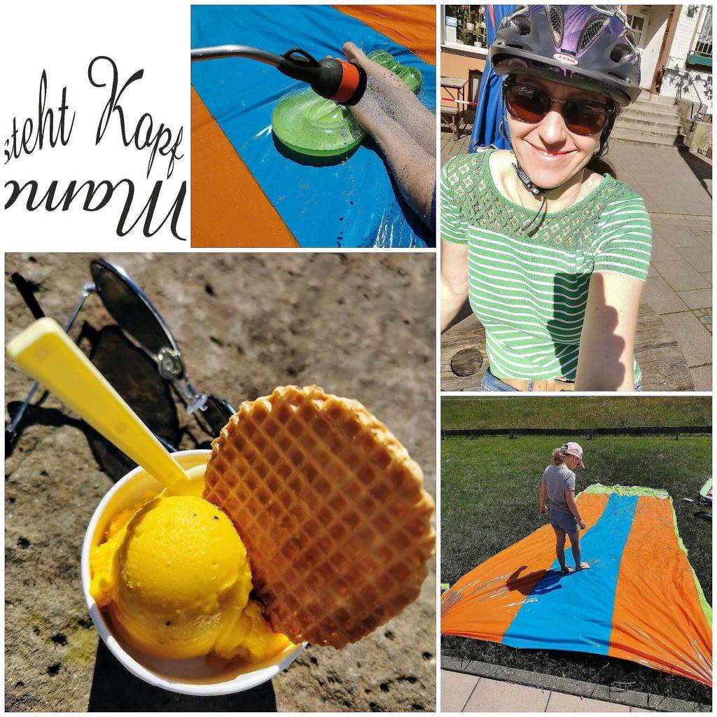 Ich bin beschäftigt, befreie die Terrasse, Tische und Stühle vom Blütenstaub – und später machen der Gatte und ich drei Kinder mittels Gartenschlauch und Plane sehr, sehr glücklich! 🙂