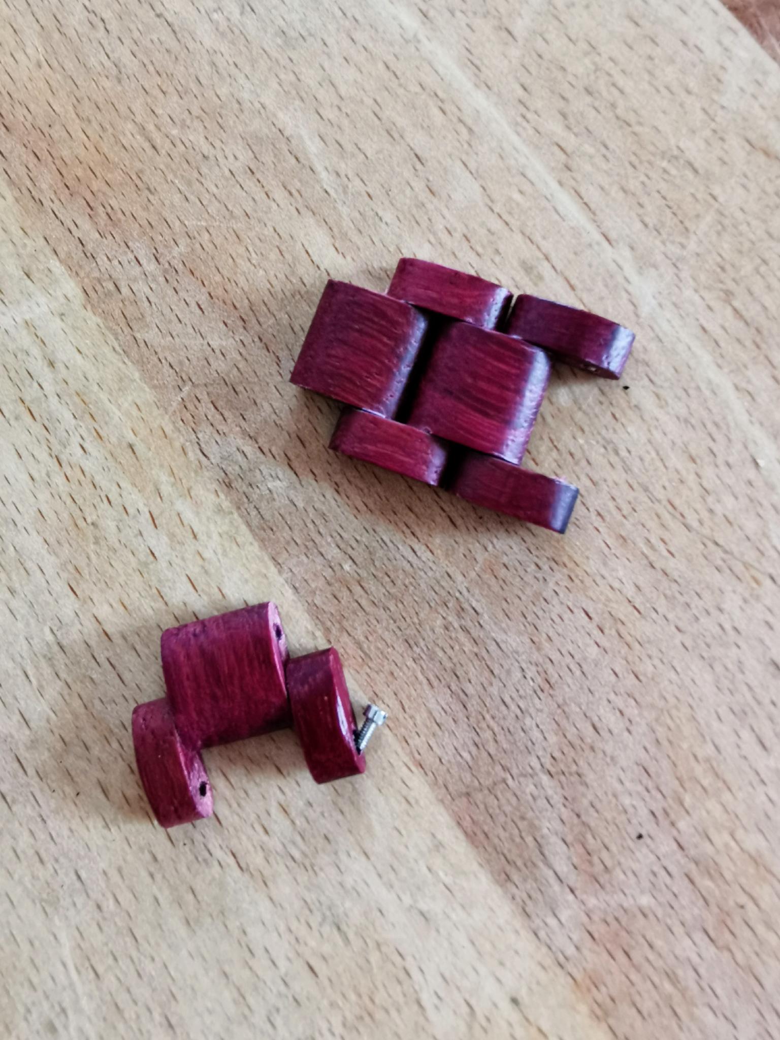 Das Armband aus Amaranth ist größenverstellbar, hier liefert Holzkern gleich das passende Werkzeug mit.