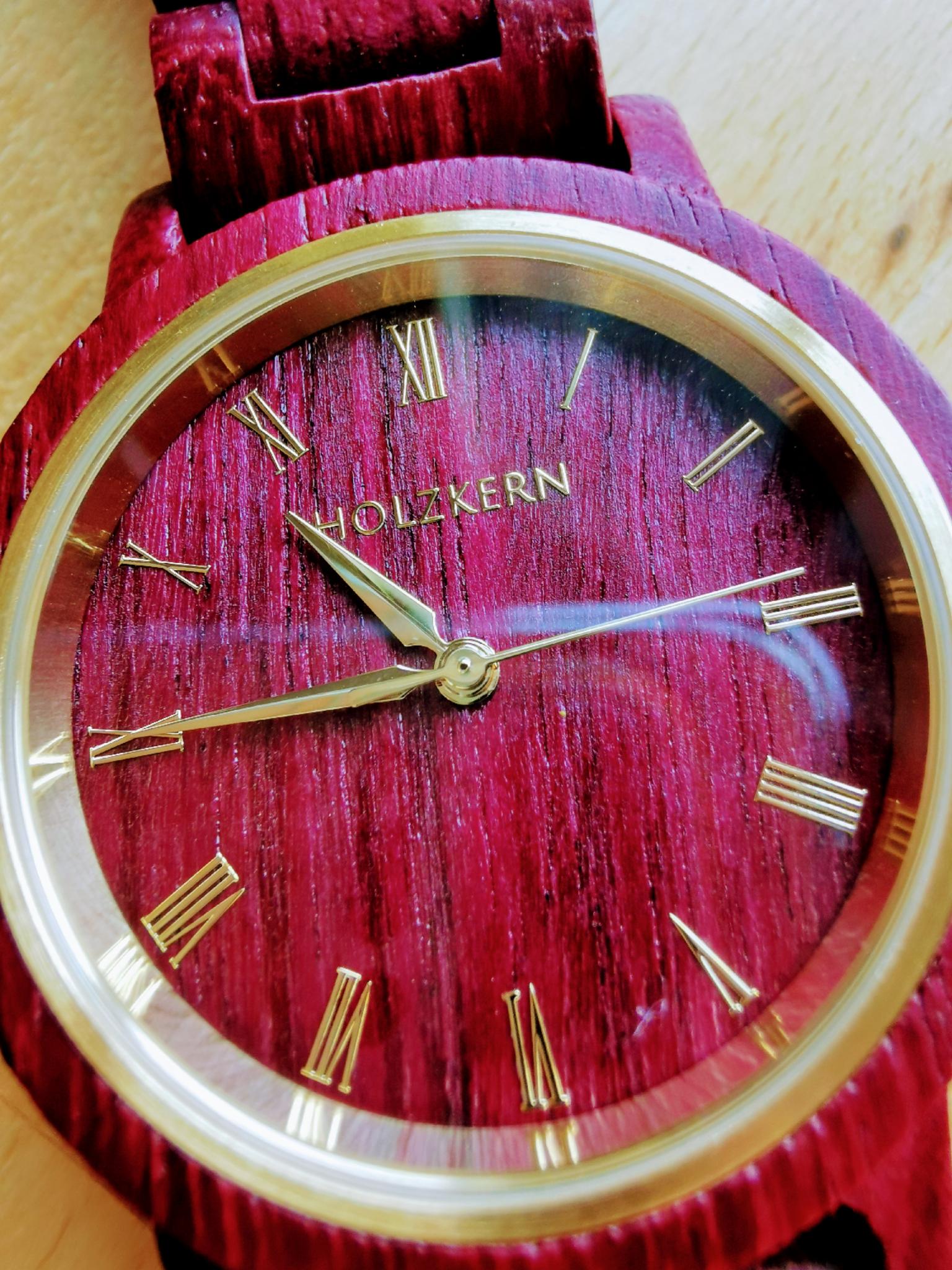 Auch das Ziffernblatt meiner Uhr besteht aus Amaranth-Holz, das Uhrwerk ist ein Quartzuhrwerk der Firma Citizen.