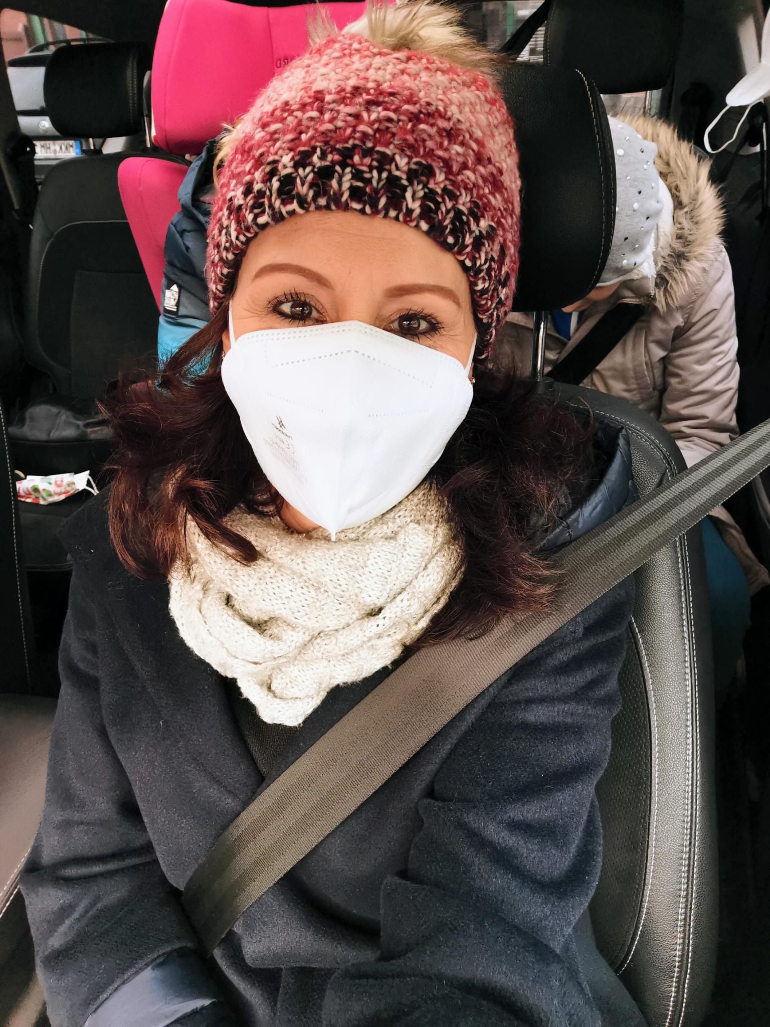 Trotz Dreifachimpfung, Maske auf der Nase und Desinfektions-Fläschchen in der Handtasche.