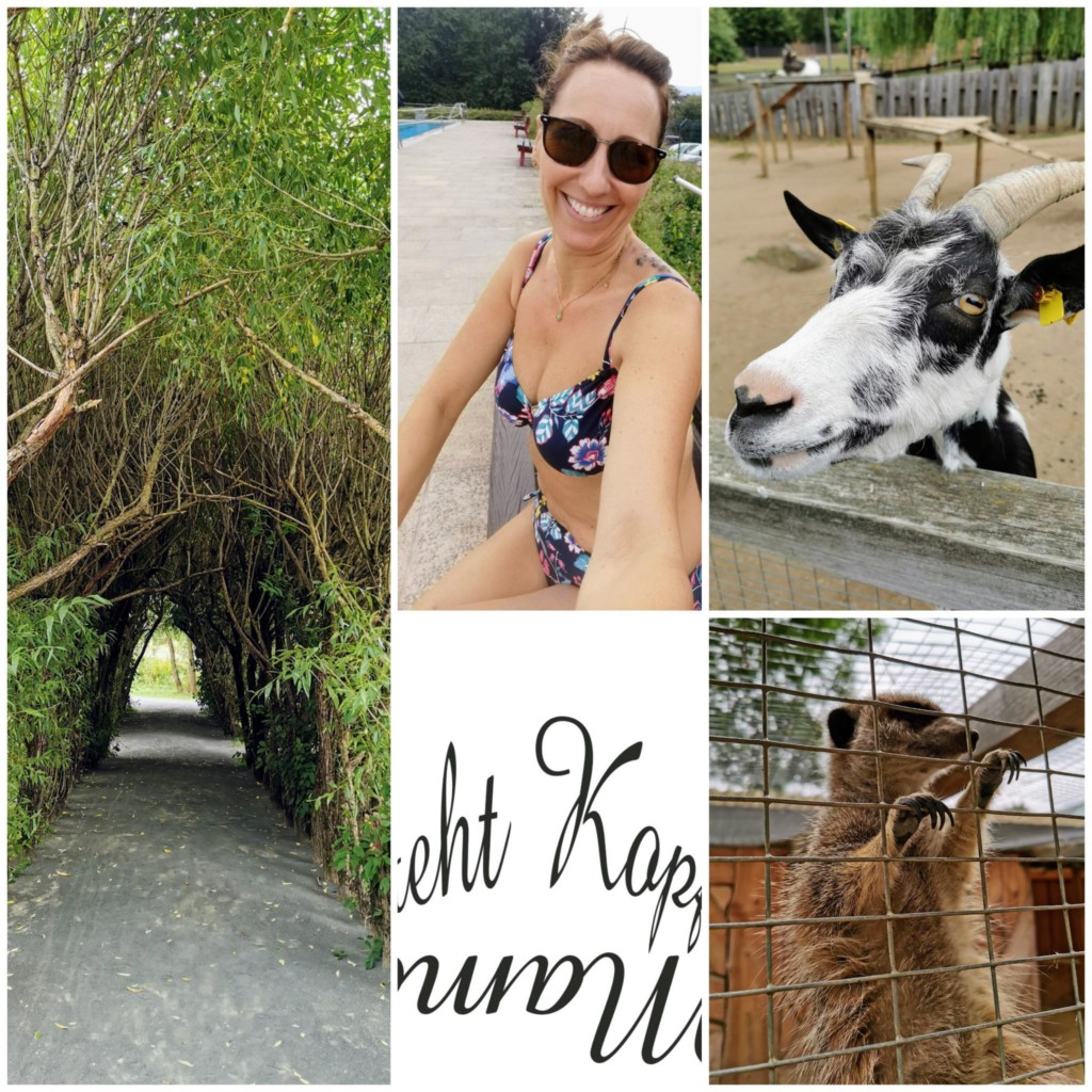 Glücklicherweise hatte ich mir in weiser Voraussicht den Bikini nebst Handtuch eingepackt – und gehe ein Stündchen im benachbarten Freibad schwimmen!