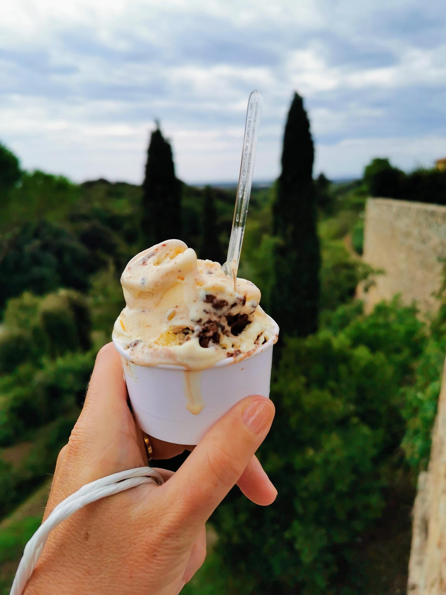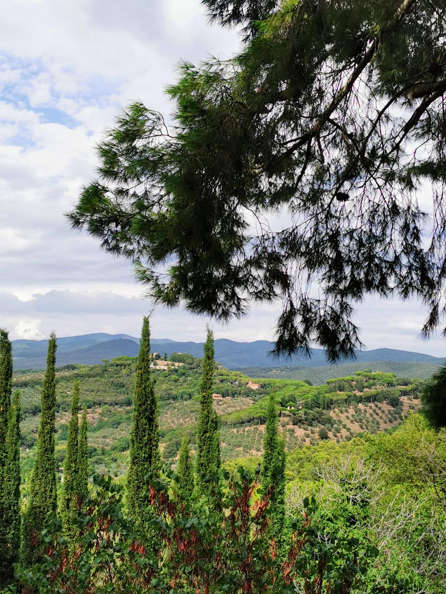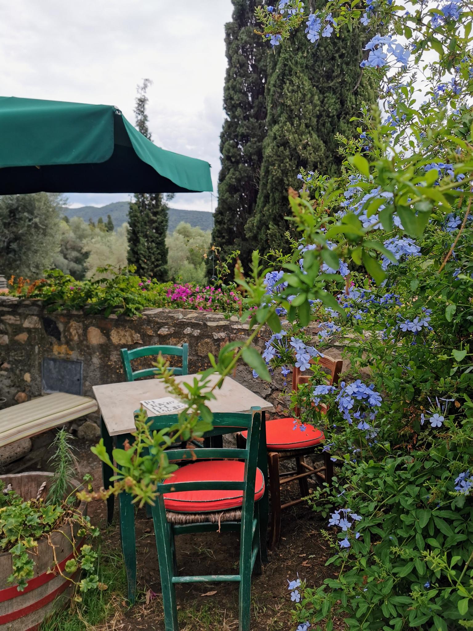 Süßesten Wein koste ich am Abend noch, vor mir Hügel und Zypressen, neben mir der Gatte und geschmackvoll hergerichtetes Rosmarin-Hähnchen im Munde.