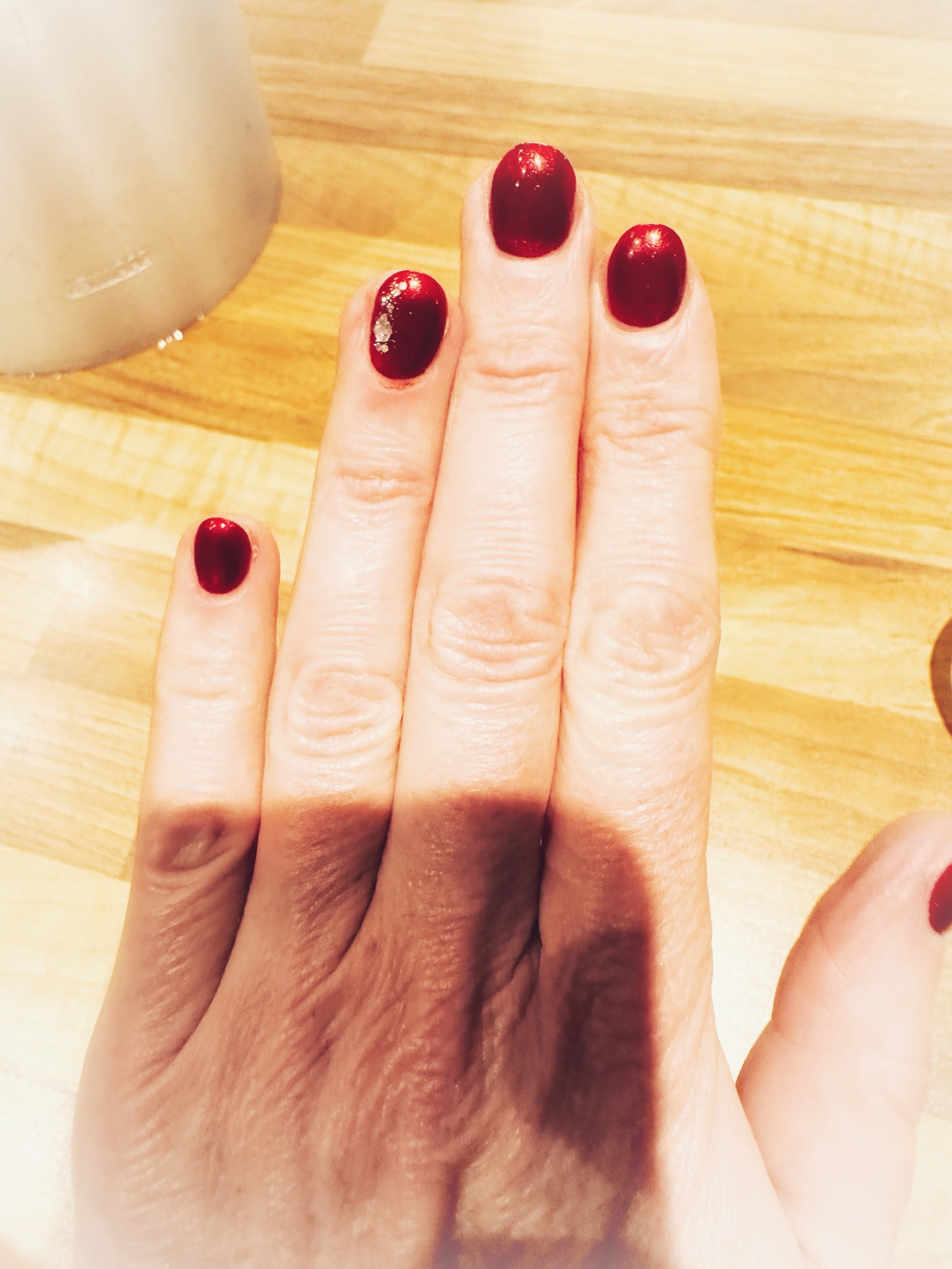 Und ich blicke auf meinen frischen (arschteuren- Pardon!) Gelnagellack und sehe auf beiden Daumen – da wo es eigentlich sexy-Vamp-mäßig rot glitzern und schimmern soll – entweder an einzelnen Stellen Deckenputz, oder der Lack ist nun mal ab!